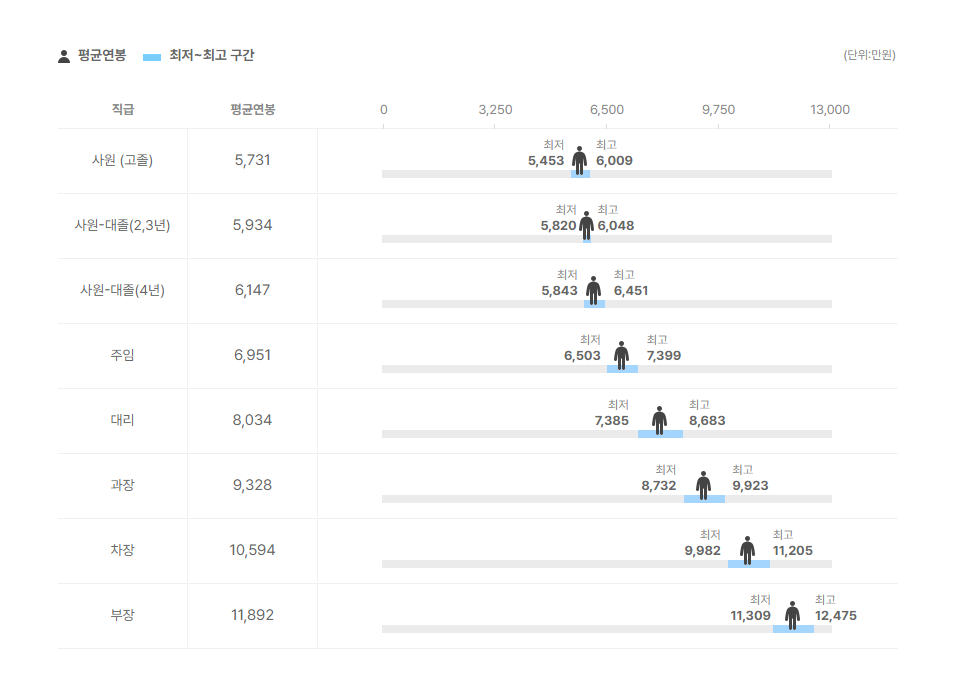 부장 연봉 11,892만원, 차장 연봉 10,594만원, 과장 연봉 9,328만원, 대리 연봉 8,034만원, 주임 연봉 6,951만원 으로 확인되었습니다.